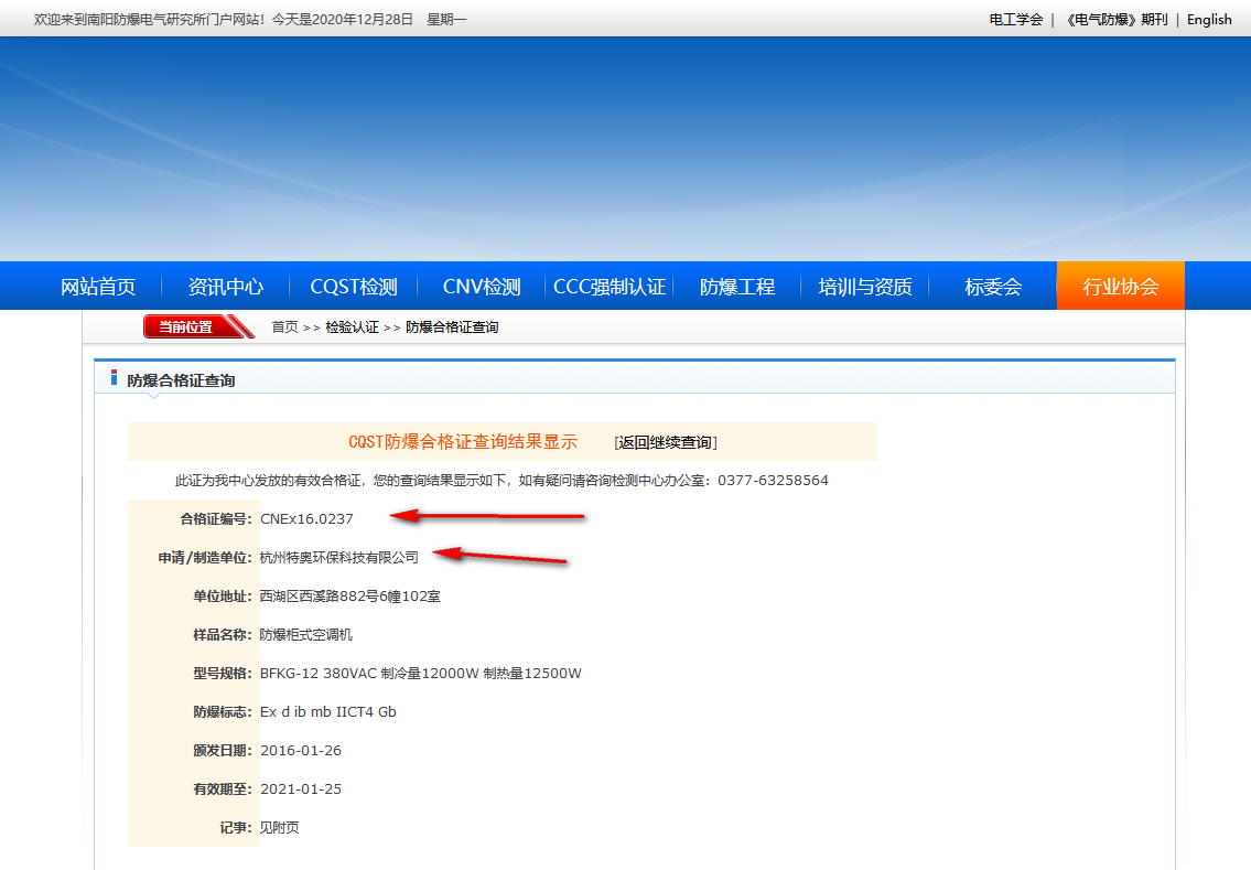 防爆合格證查詢步驟:首先登陸查詢網(wǎng)站,然后輸入合格證書編號,廠家名稱,點(diǎn)擊查詢即可查到防爆合格證資質(zhì)信息。一般生產(chǎn)防爆產(chǎn)品企業(yè),取生產(chǎn)許可證,需要南陽電氣研究所頒布的防爆合格證。因此,現(xiàn)以南陽頒發(fā)的防爆合格證這個網(wǎng)站查詢?yōu)槭纠?。舉例: 杭州特奧環(huán)保科技有限公司的防爆空調(diào)防爆合格證
